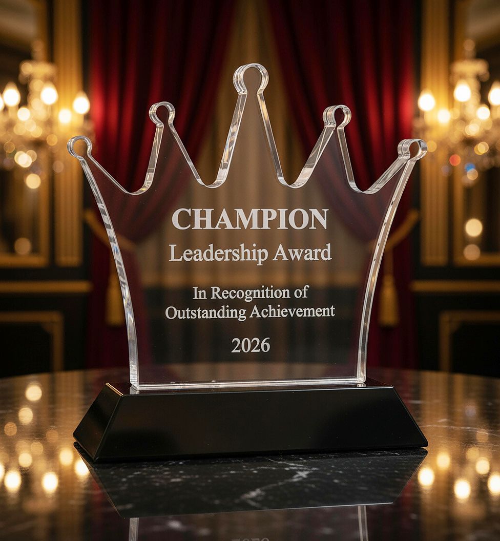 Rule the podium with the elegant Crystal Crown Trophy. This striking award features a clear, sparkling crystal crown design that symbolizes achievement, leadership, and excellence. The graceful, regal crown silhouette rises beautifully above a sleek black base, creating a modern yet timeless look that commands attention on any shelf or display.