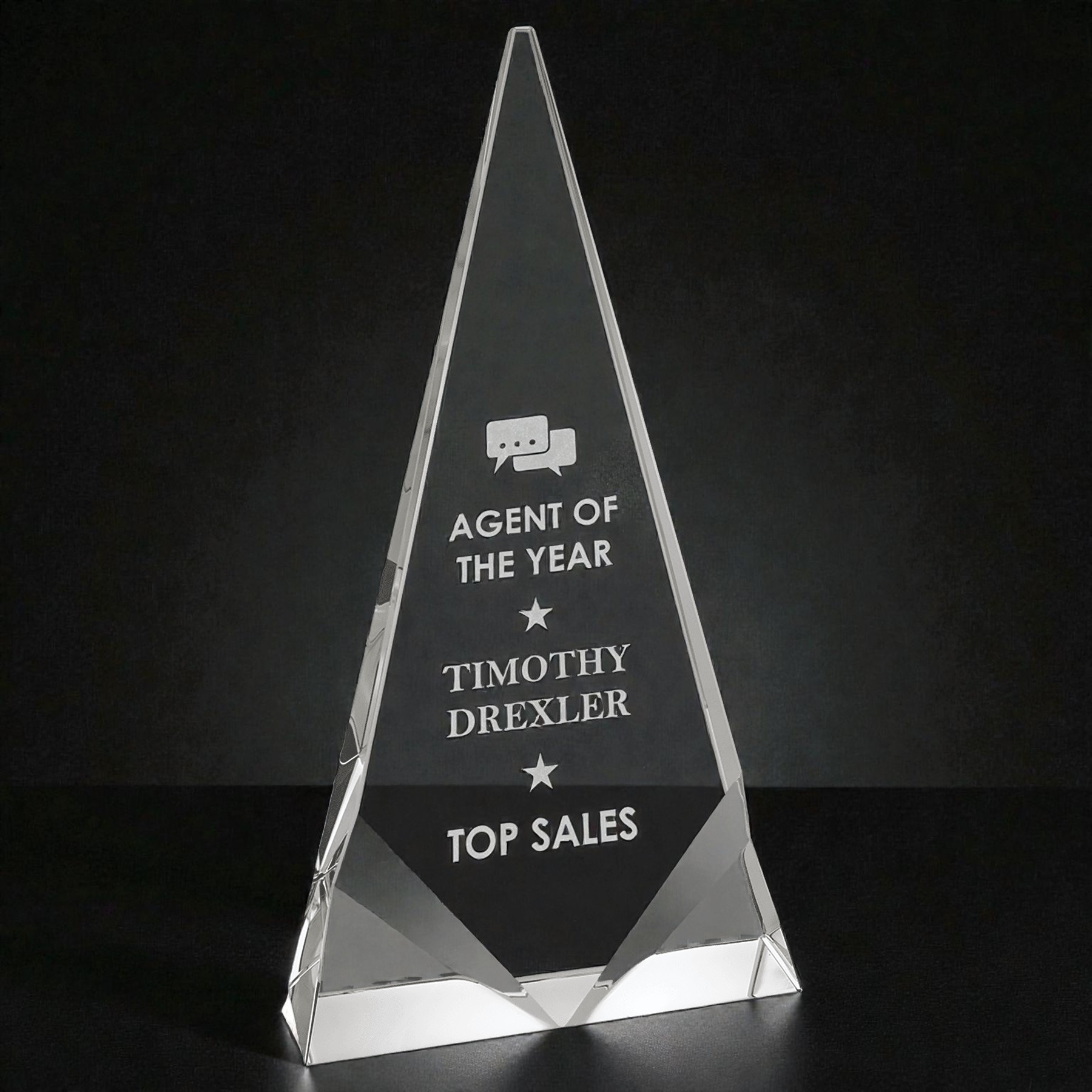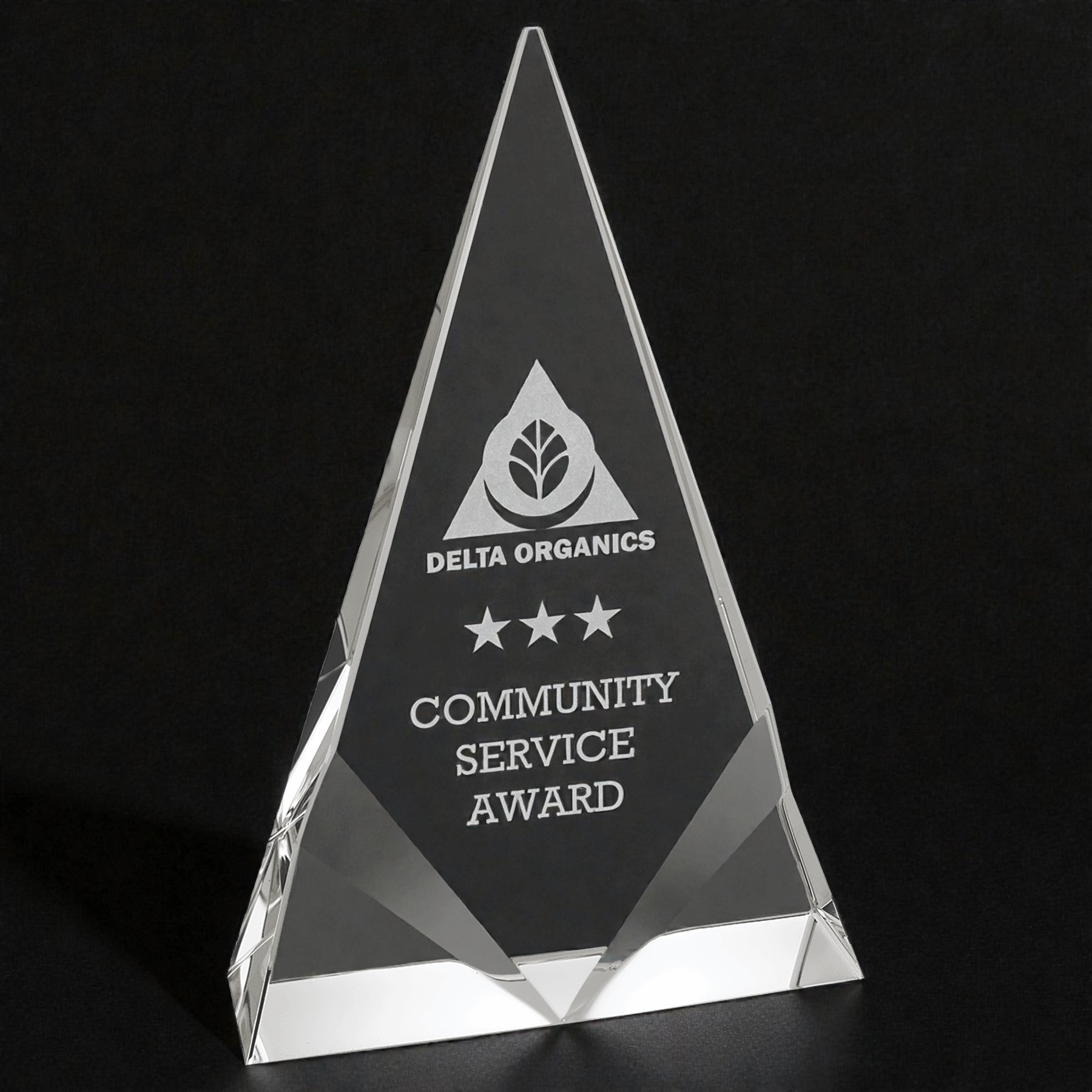 The Crystal Triangle Award (CRY261ML) is a stunning, modern recognition piece crafted from premium optical crystal. Its sleek triangular silhouette exudes elegance and sophistication, making it an ideal choice for celebrating achievements, milestones, leadership, sales excellence, or any noteworthy accomplishment. Made from solid, thick clear crystal, this award captures and refracts light beautifully, creating a dazzling prismatic effect that draws attention from every angle. The design features decorative bevels at each bottom corner for added visual interest and a substantial, weighted base that allows the piece to stand securely on its own. A generous central area is perfectly suited for free laser engraving, allowing you to personalize it with names, logos, dates, or custom messages that commemorate the occasion with lasting impact. Available in two impressive sizes to suit different levels of recognition: