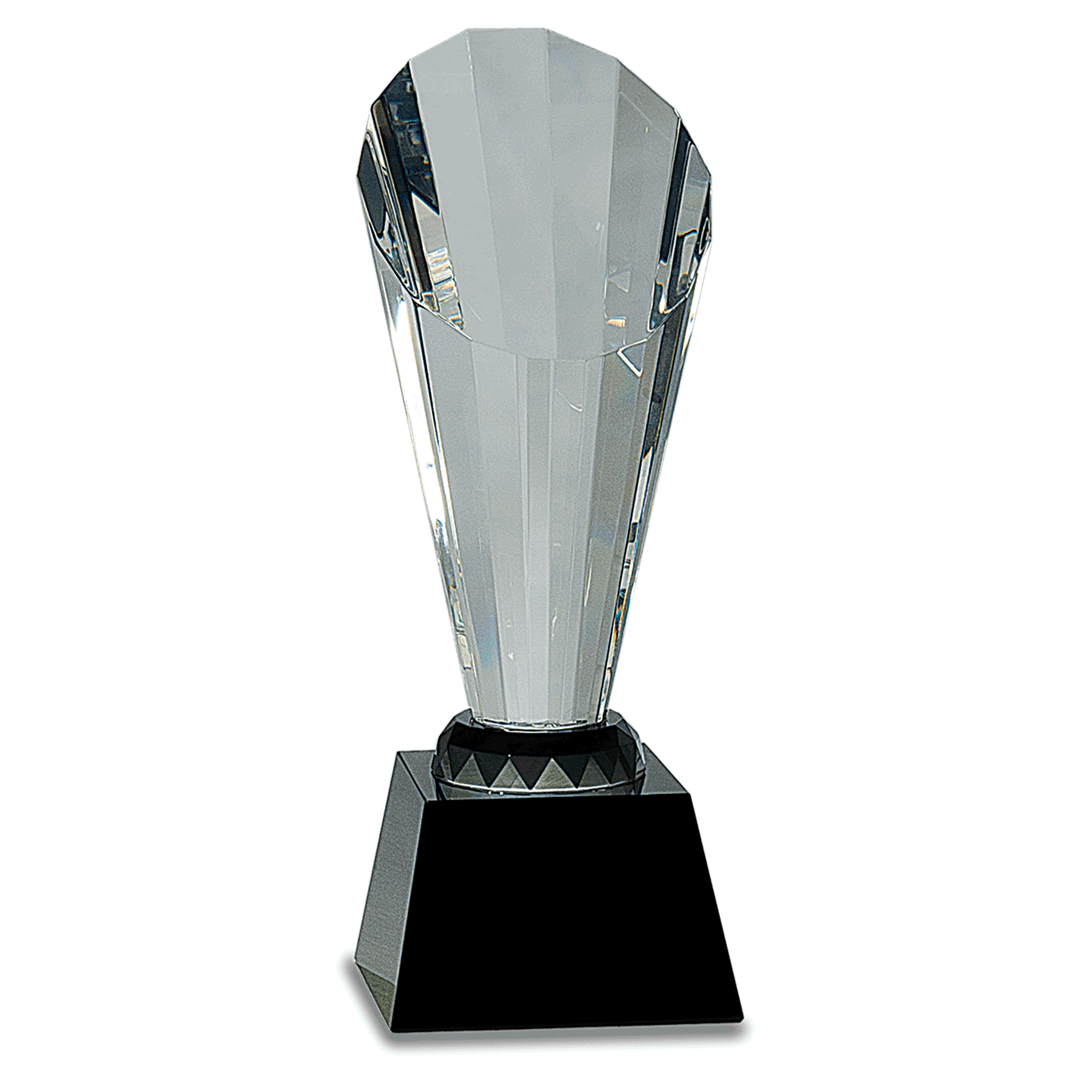 A spire in Middle Age architecture was used to grab the attention of those in the surrounding community, and now we have incorporated that attention grabbing ability into our latest award we call the Rising Spire Crystal trophy. Standing nearly a foot tall (10”), our spire trophy comes anchored to an ebony cube, but a multi-faceted solid piece of crystal springs upward to provide an engraving plate cut on angle. Our skilled designers can engrave your artwork (emblem, logo, or mascot) onto the award plus still have room for up to six lines of type. Our designers use a laser engraver that will exactly duplicate your artwork and words of congratulations. This eye catching trophy comes with free engraving, a free presentation box, and free shipping! Inspire the people in your business, educational institute, or service organization by presenting them our Rising Spire Crystal trophy, item #CRY059M.