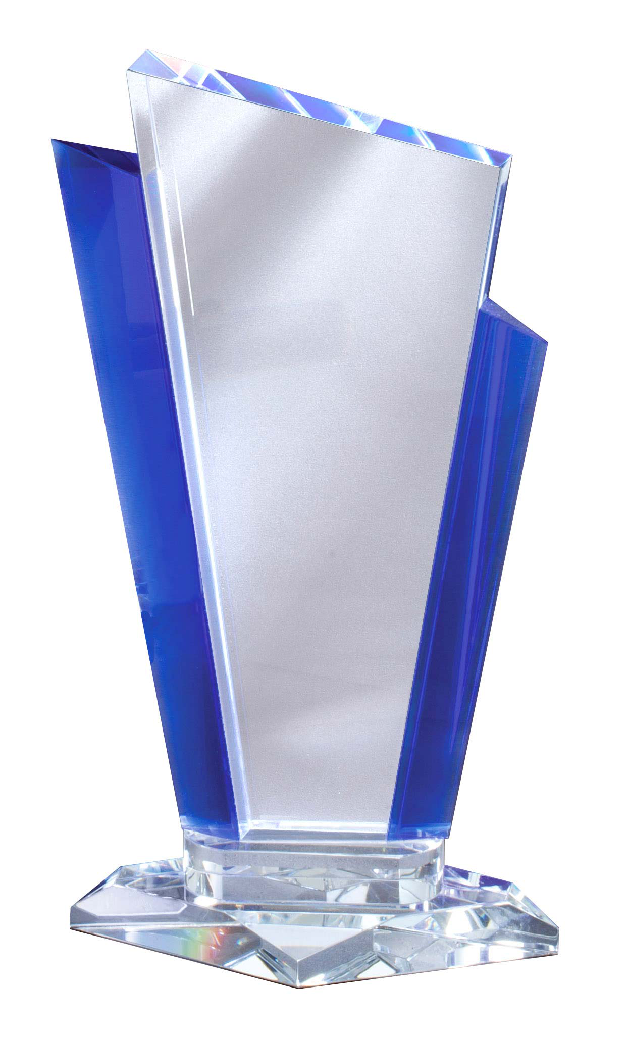Our Peerless Glass Trophy has a very distinctive shape that captures the elegance of a fine vase with its flattened flask shape. Perched atop a clear glass base that is cut to look like an exquisite diamond, the sides are a beautiful shade of sapphire blue glass. The whole structure sparkles like a fine jewel in the ambient light. This trophy would be very attractive if placed near a window with natural light or another source of light. The center plate is a very attractive slate black with plenty of space for personalized laser engraving. This beautiful trophy would be a perfect choice for a business award, politician, or a non-profit organization where the award needs to reflect the ultimate in excellence. This item also comes packaged in a presentation box that is lined with satin, another classy touch.