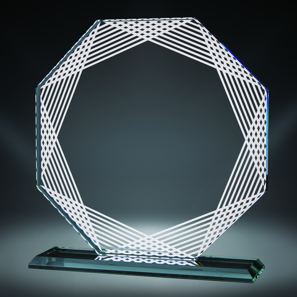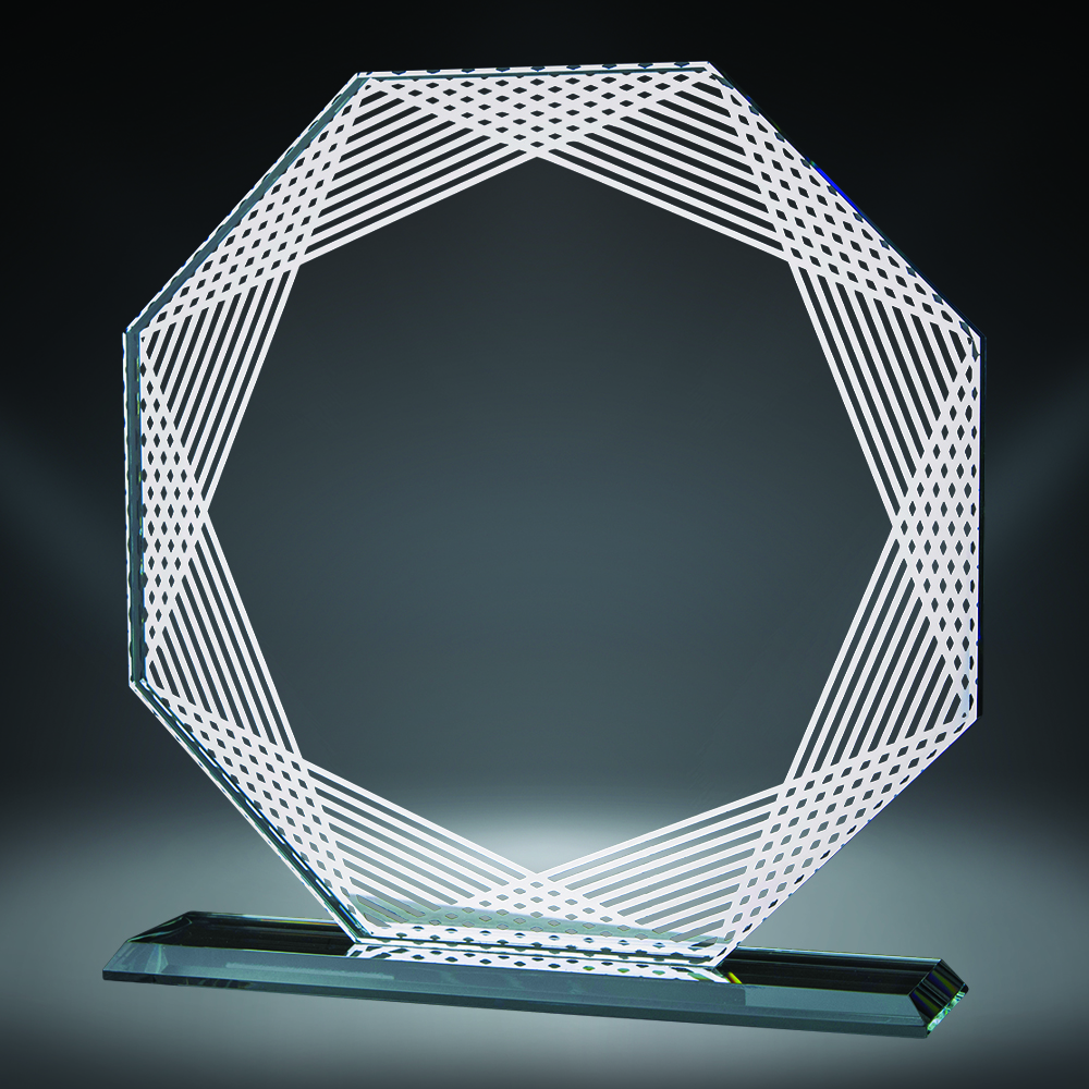 The Rayado Octagon Glass Award is a striking and modern tribute that beautifully combines geometric elegance with premium craftsmanship. Featuring a distinctive octagon-shaped glass panel with a sophisticated decorative border, this award is elegantly mounted on a clear glass base, creating a floating, contemporary look that catches light from every angle.