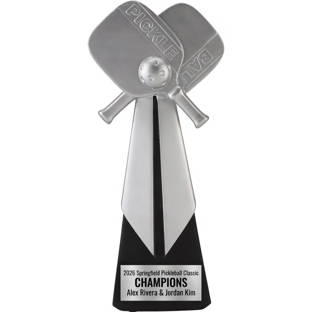 Celebrate pickleball excellence with the striking Aspire Pickleball Trophy (AS10-PCK). Standing a commanding 10 inches tall, this premium resin trophy captures the energy and spirit of the game with a dynamic centerpiece featuring two crossed pickleball paddles and a detailed pickleball at the apex. The sleek silver finish on the paddles and ball contrasts beautifully against the modern black and silver body, creating an eye-catching award that instantly recognizes achievement on the court.Weighing 3 lbs., the trophy feels substantial and high-quality in hand. Its elegant tapered design rises from a solid black base, providing a perfect canvas for personalization. The bottom black area is ideal for laser engraving or a custom silver plate, allowing you to immortalize tournament names, champion titles, player names, and dates with crisp, professional results.
