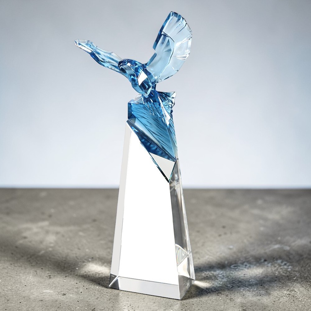 The Eagle’s Triumph Crystal Award (C2601) is a commanding symbol of victory, leadership, and elevated success. This contemporary crystal design features a striking blue crystal eagle poised triumphantly at the top, its sleek form embodying strength, vision, and freedom. The eagle connects seamlessly to a tall, crystal-clear pillar that rises with elegant simplicity, drawing the eye upward in a powerful vertical flow that celebrates achievement and aspiration.Crafted from premium optical crystal, the award measures 2.25″ x 4.75″ x 12.75″ tall and weighs 5 lbs, offering a substantial yet refined presence perfect for desk displays, trophy cases, or corporate showcases. The bold blue eagle contrasts beautifully with the pristine clear base below, delivering a modern, sophisticated aesthetic ideal for executive recognitions, sales awards, military honors, leadership milestones, or any occasion honoring perseverance and triumph. Personalization comes standard with complimentary engraving—add names, dates, logos, or custom messages etched directly into the crystal for a professional, lasting tribute. Each award ships free in a deluxe gift box, making it easy to present with pride.More than just a trophy, the Eagle’s Triumph Crystal Award inspires awe and serves as an enduring reminder of goals achieved and heights reached. Honor those who soar above the rest with this iconic piece that captures the spirit of true victory.